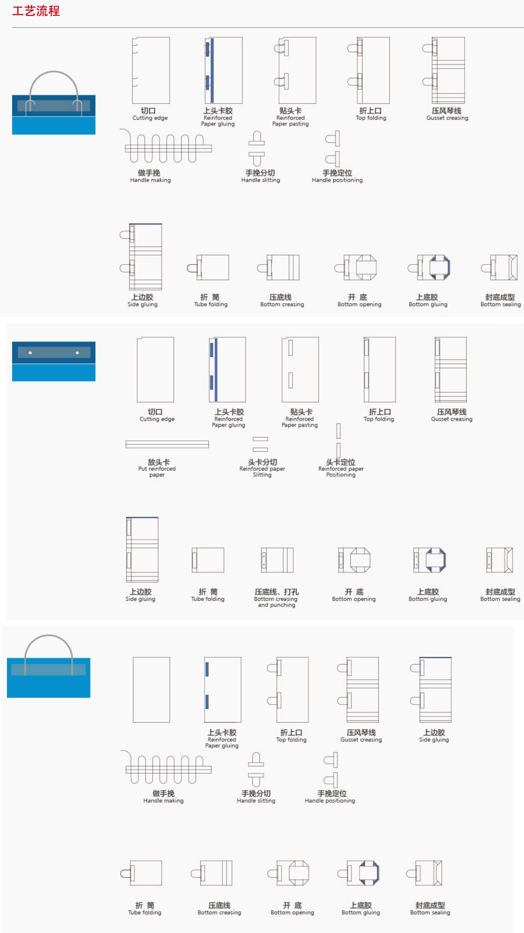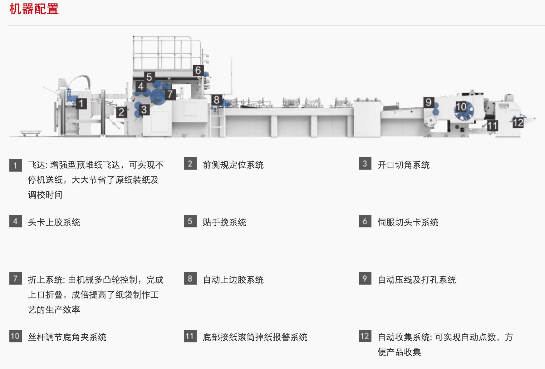 ZB1260S-450單張式全自動手提袋製袋機(採用意大利技術)是一台以單張紙、捲筒式頭卡及紙繩為原料,一次性完成把手製造,貼把手,折上口(或不折上口),成筒,成風琴,封底,壓實成型和貼頭卡,折上口,成筒,成風琴,打雞眼孔,封底,壓實成型三種完美工藝,一機三用,物超所值。